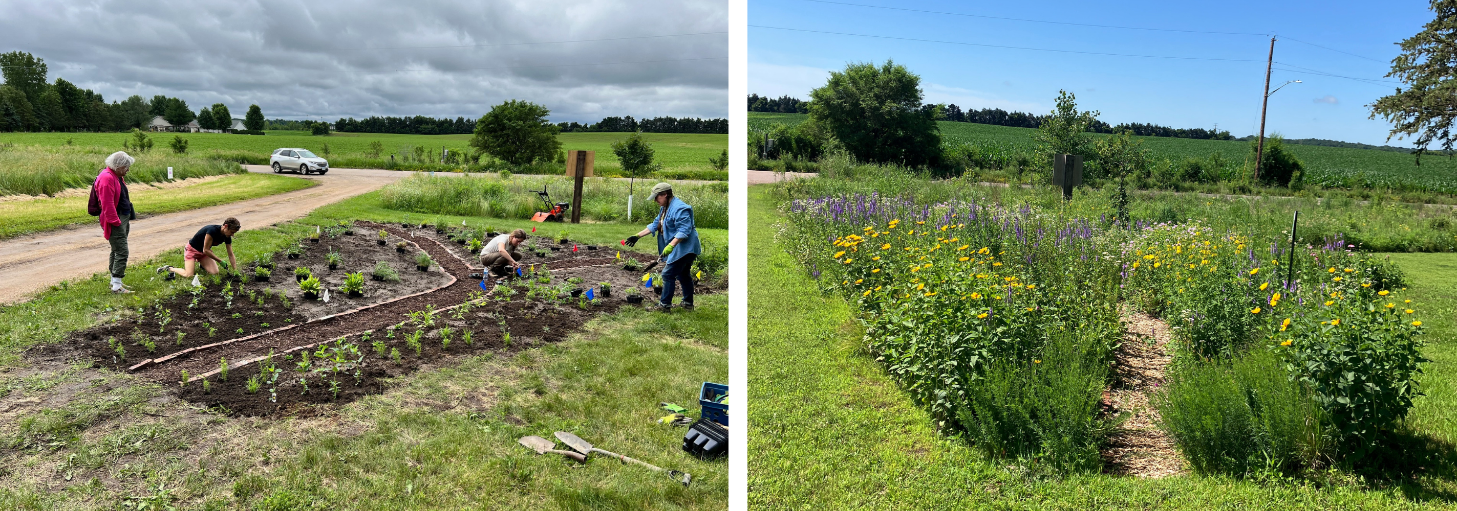 New gardens throughout the property provide both habitat and welcoming learning spaces. A memorial garden near the Farm House honors Kim Devine Johnson, one of the founders of the Prairie Oaks Institute. A butterfly garden planted during the first Butterfly Days event continues to bloom with seasonal color and pollinator activity. At the Harvest House, volunteers helped install a rain garden that improves stormwater management while supporting a diverse array of native plants.
