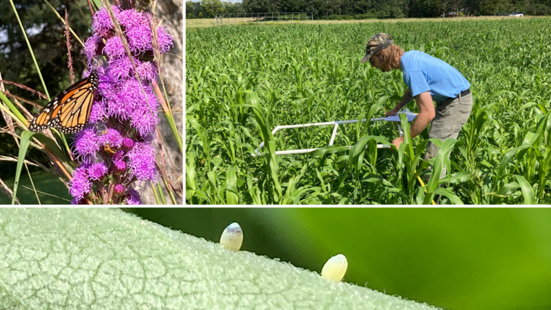 On August 20, 2025, we conducted our first-ever IMMP survey in a 3-acre field that was historically wheatgrass (also called kernza) and currently in a pollinator-friendly cover crop. This survey is an important step in accurately measuring future changes. We documented 17 blooming forbs, including 3 native and 14 non-native species. Of particular interest to us, not surprisingly, is milkweed, which is necessary for monarchs to reproduce. Although no common milkweed (Asclepias syriaca) was planted in the cover crop, we found a density of 121 stems per acre. Of the 44 milkweed plants searched for monarch eggs and larvae, we found 14 eggs and 4 larvae. During our 500-meter survey walk, we observed 4 adult monarchs. These findings suggest that Prairie Oaks already had great potential for pollinator habitat.